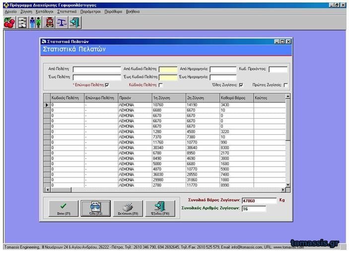 - Στατιστικά στοιχεία ζυγίσεων ανά ημέρα, εβδομάδα, μήνα, χρόνο, κ.τ.λ. για προϊόντα, πελάτες, προμηθευτές, αυτοκίνητα, αγορές, πωλήσεις.